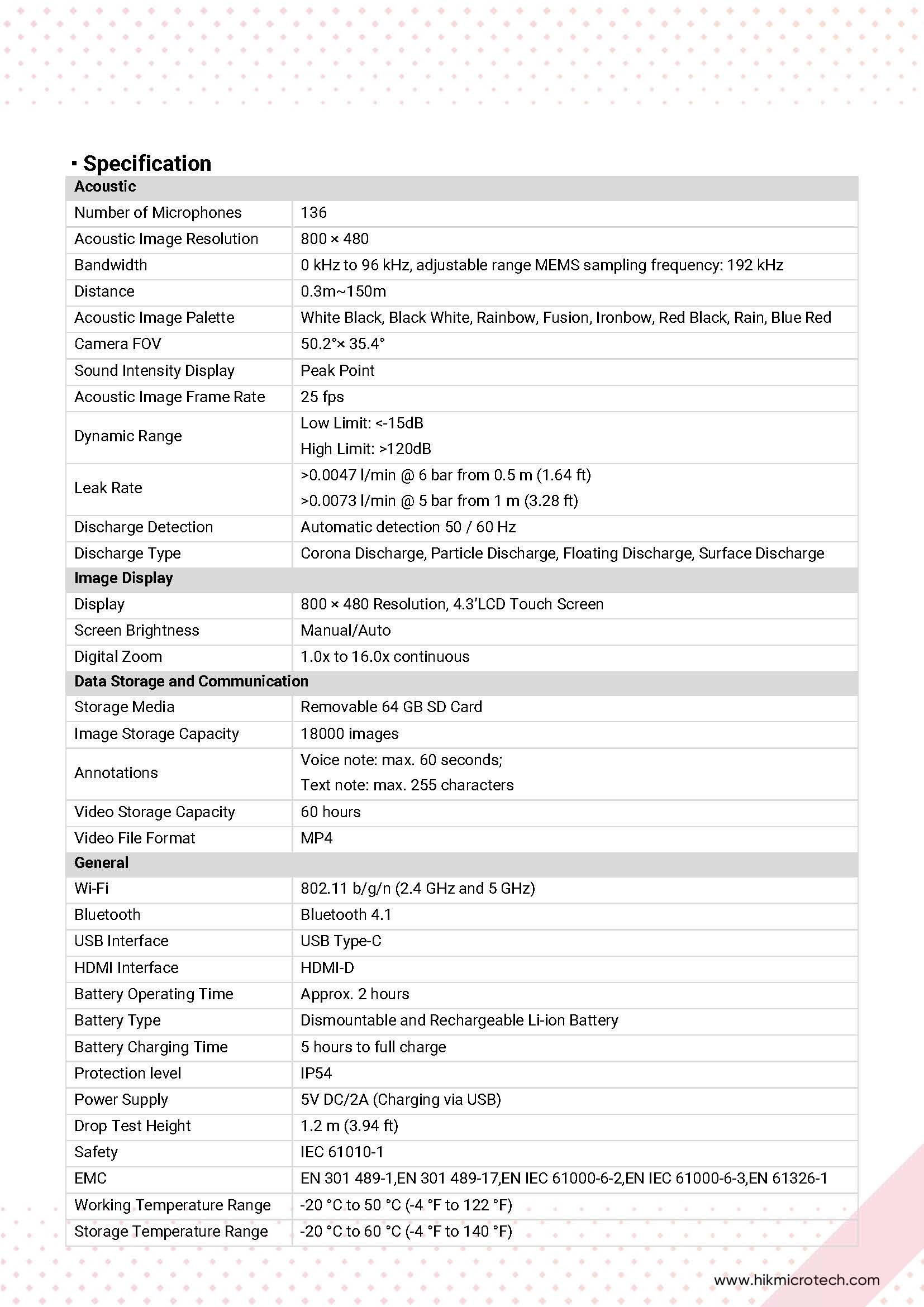 دوربین HIKMICRO AI76 یک دوربین تصویربرداری آکوستیک است که برای تشخیص نشت گاز و تخلیه جزئی طراحی شده است. این دستگاه دارای یک صفحه نمایش لمسی LCD بزرگ ۴.۳ اینچی است که نتایج را روی یک تصویر دیجیتال نمایش میدهد و کاربران را قادر میسازد تا به سرعت منابع مشکل را مشخص کنند.