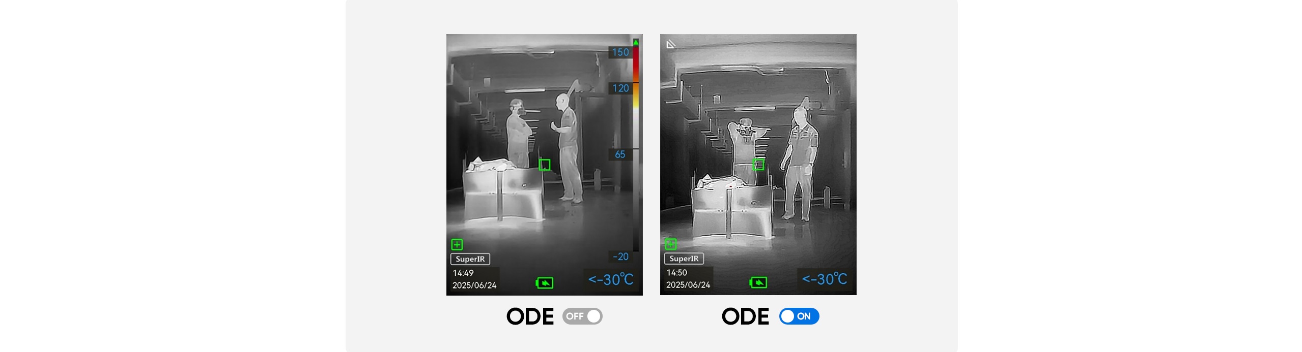 پوششهای حرارتی با رنگ کاذب بر اساس نقشهبرداری دما هستند که جزئیات بصری را در مناطق گرم مشخص میکنند. ODE وضوح را بدون تغییر دادههای حرارتی افزایش میدهد. در HIKMICRO FP21 با فعال بودن این عملکرد، خطوط و مرزهای هدف واضحتر خواهد بود، اما نویز تصویر نیز به همان نسبت افزایش مییابد.