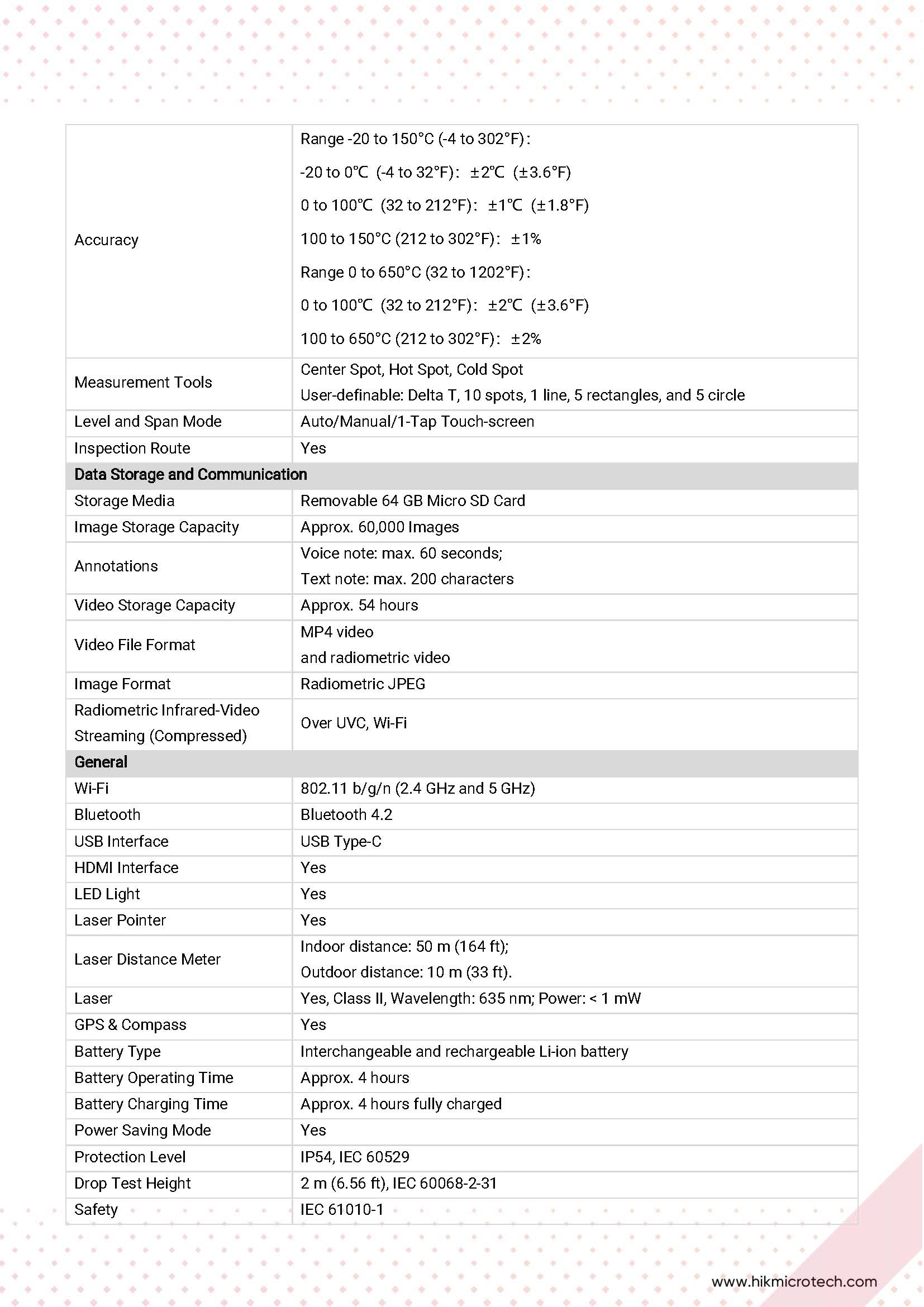 - محدوده اندازهگیری دما: ۲۰- °C تا ۶۵۰ °C (۴ °F- تا ۱۲۰۲ °F)