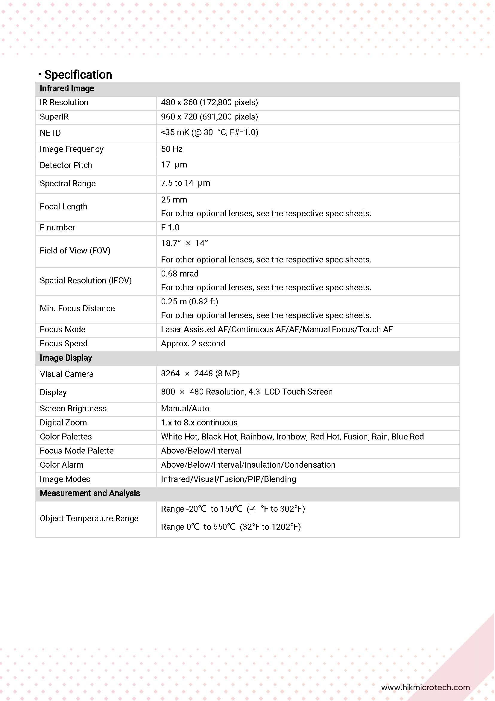 - وضوح حرارتی: ۴۸۰ ۳۶۰x (۱۷۲۸۰۰ پیکسل)، NETD: <35 mK (@ 30 °C, F#=1.0)