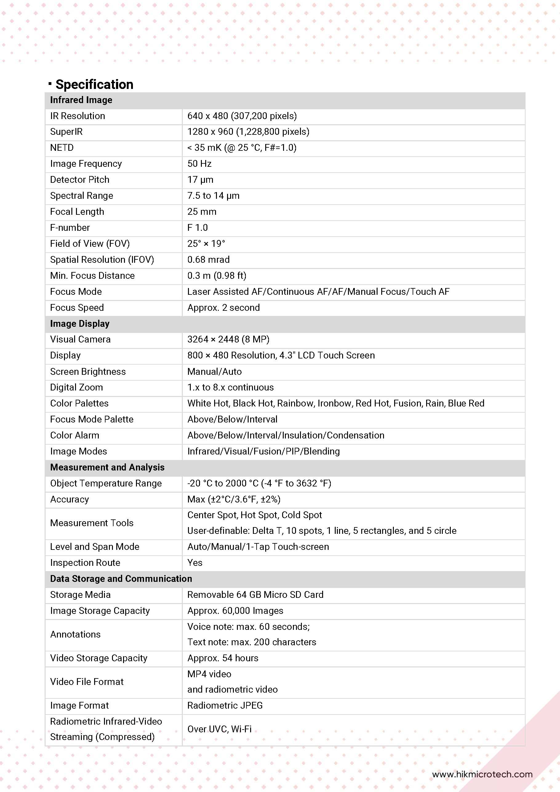 و کالیبراسیون دما تا 2200 درجه سانتیگراد است. ویژگیهای پیشرفته به متخصصان تصویربرداری حرارتی کمک میکند تا به راحتی تجهیزات را بررسی کرده و علائم نقص مانند حاشیهنویسی GPS و قطبنما، بزرگنمایی دیجیتال مداوم و سطح و دهانه با یک ضربه را پیدا کنند. برای انتقال، تجزیه و تحلیل و اشتراکگذاری تصاویر و ایجاد گزارشها به صورت رایگان، برنامه HIKMICRO Viewer یا نرمافزار HIKMICRO Analyzer را متصل کنید.