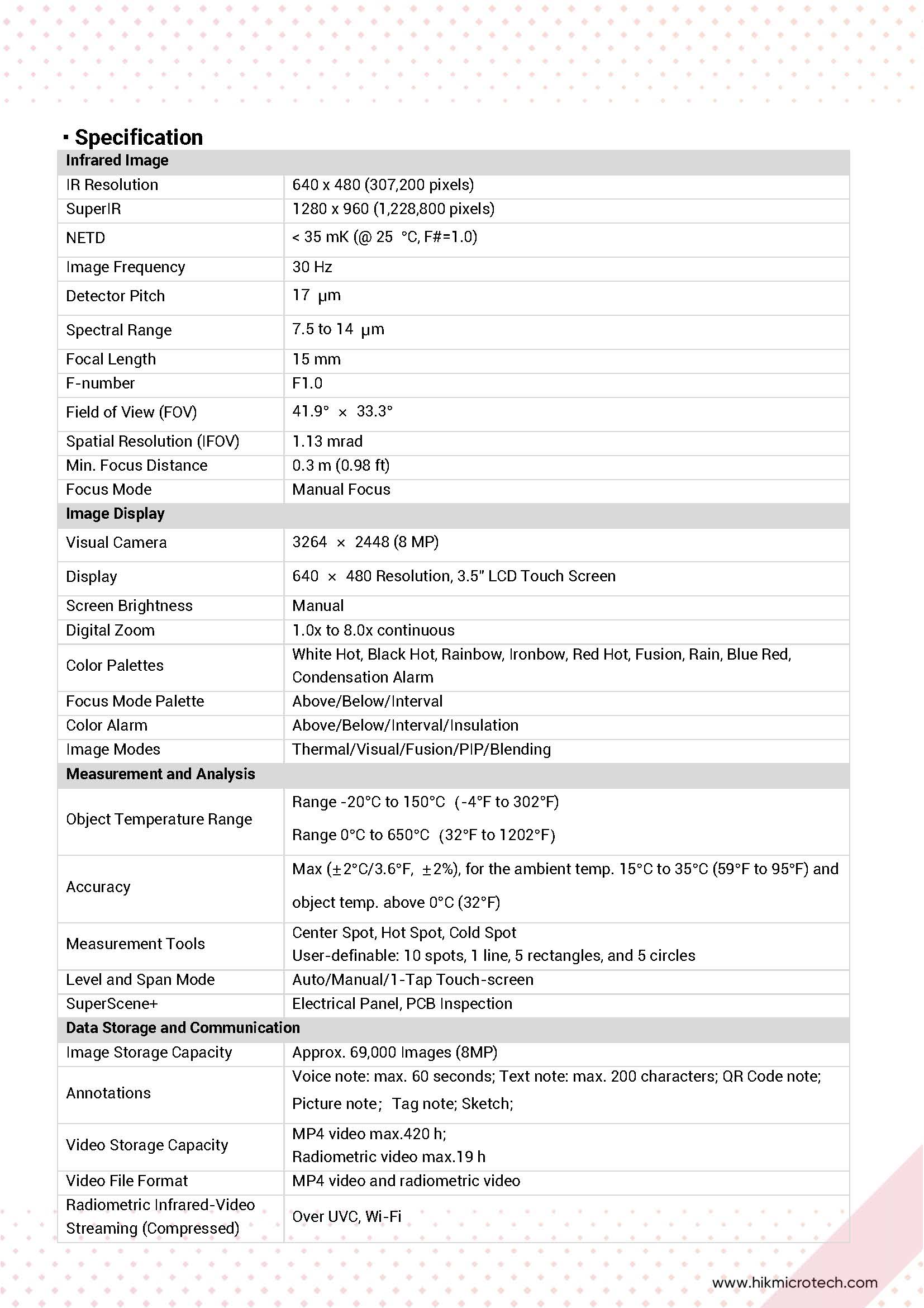 - دقت اندازهگیری دمای بالا: حداکثر (۲± درجه سانتیگراد/۳.۶ درجه فارنهایت، ۲٪±)، برای دمای محیط ۱۵ تا ۳۵ درجه سانتیگراد (۵۹ تا ۹۵ درجه فارنهایت) و دمای اجسام بالاتر از ۰ درجه سانتیگراد (۳۲ درجه فارنهایت)