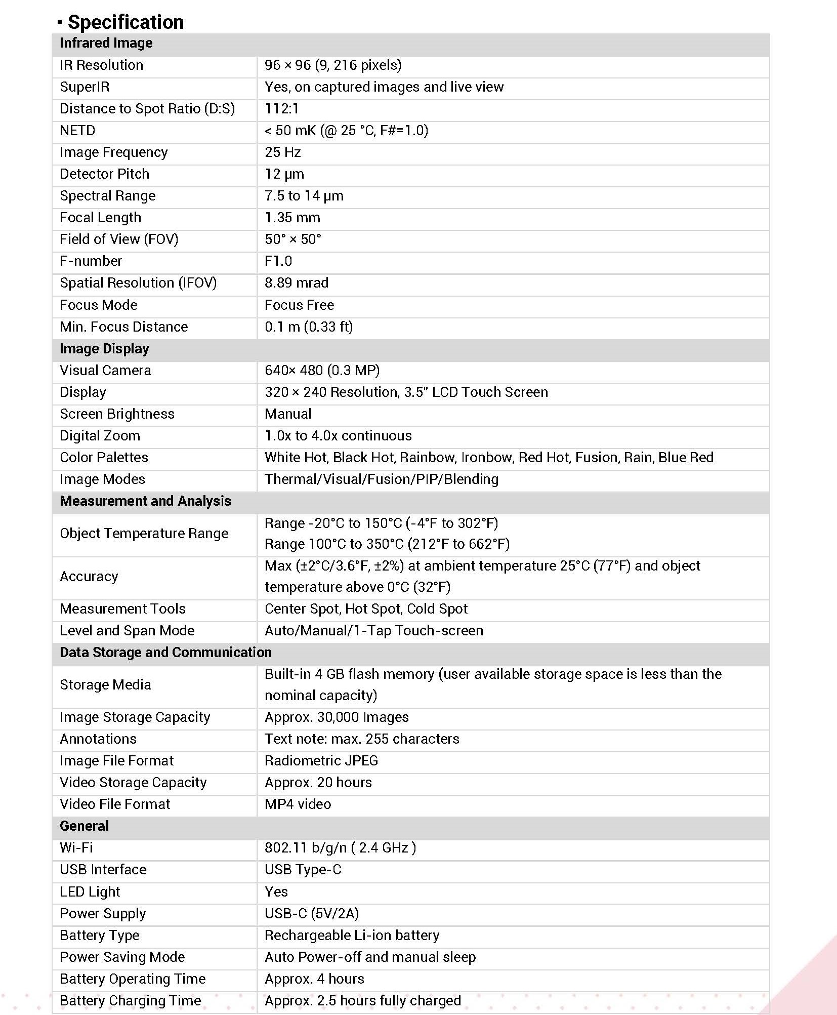 - رزولوشن مادون قرمز (IR Resolution): 96 × 96 (9216 پیکسل)، NETD: کمتر از 50 میلیکلوین (در دمای 25°C، F# = 1.0)