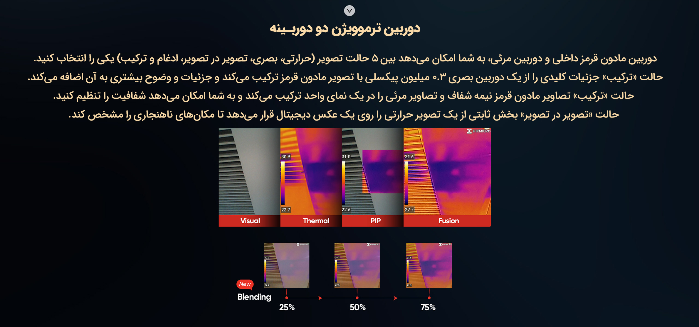 - حالتهای تصویر: حرارتی، تلفیقی (Fusion)، تصویر در تصویر (PIP)، مرئی و ترکیبی (Blending)